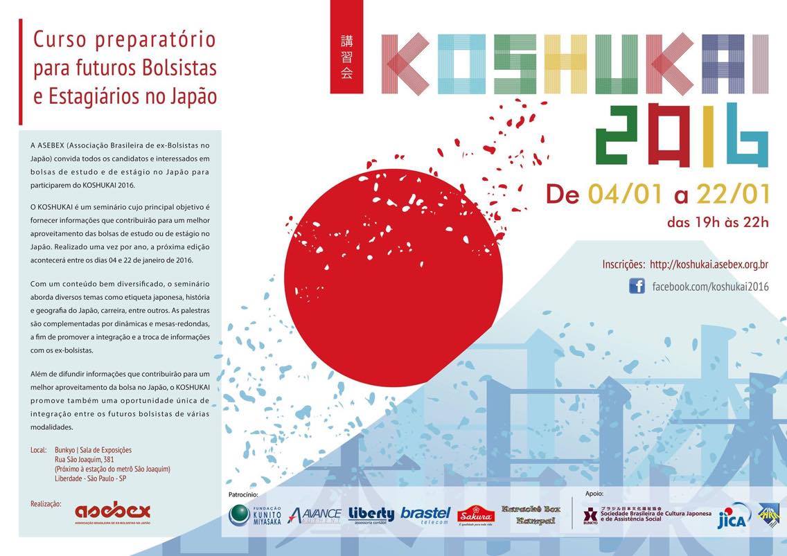 A ASEBEX (Associação Brasileira de ex-Bolsistas no Japão) convida todos os candidatos e interessados em bolsas de estudo e de estágio no Japão para participarem do KOSHUKAI 2016.