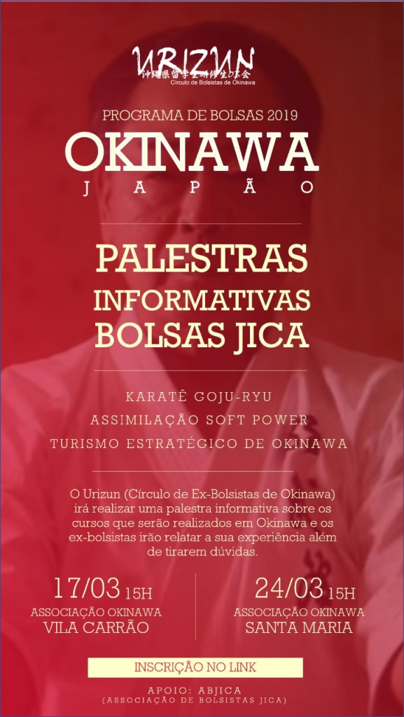 O Urizun (Círculo de Ex-Bolsistas de Okinawa), com o apoio da Abjica, irá realizar uma palestra informativa sobre os cursos que serão realizados em Okinawa e ex-bolsistas irão relatar suas experiências, além de tirarem dúvidas.
