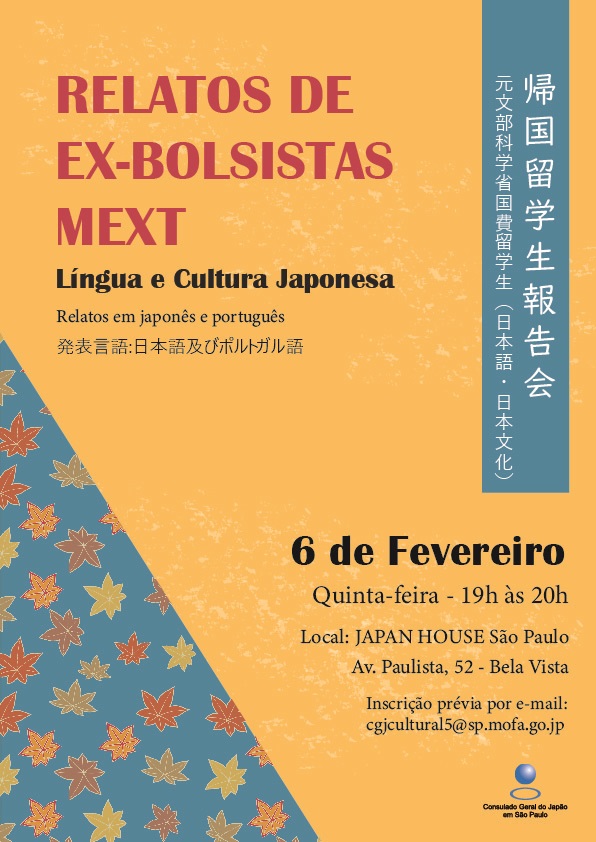 O Consulado Geral do Japão em São Paulo estará realizando nessa quinta-feira um encontro com relatos de ex-bolsistas da modalidade de língua e cultura japonesa. Esta é uma das modalidades oferecidas pelo Ministério da Educação, Cultura, Esporte, Ciência e Tecnologia (MEXT) do Japão.