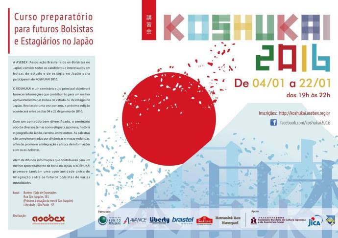 A ASEBEX (Associação Brasileira de ex-Bolsistas no Japão) convida todos os candidatos e interessados em bolsas de estudo e de estágio no Japão para participarem do KOSHUKAI 2016. – Caráter do evento: Seminário informativo e interativo realizado anualmente. Inclui palestras, mesas-redondas e dinâmicas de grupo. – Público-alvo: candidatos e interessados em bolsas de estudo e estágio no…